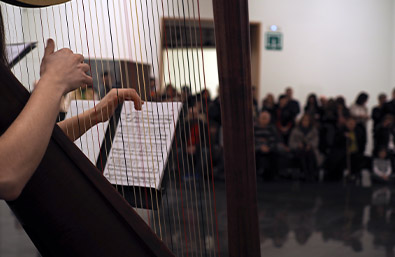 The rooms of the University of Navarra Museum are filled with harps to offer an encounter with contemporary music in which performers, audience, and composer experiment with the museum's architecture as another acoustic and musical element.